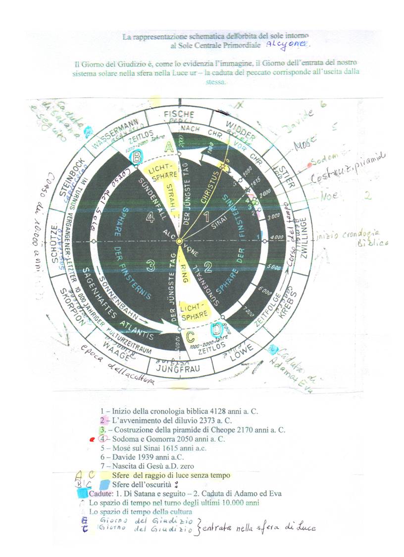 6. Per la promozione della crescita spirituale dell’alter ego, sono previsti nel cosmo, nel piano della Creazione ogni circa diecimila anni, con un’interruzione da 1.000 a 2.000 anni, delle epoche che ritornano periodicamente, per procurare una volta, affinché lo sviluppo dell’umanità trovi la risalita nella libera decisione della scelta tra il bene e il male, tra l’amore e la sofferenza, per propria iniziativa – nel buio del potere avvolgente della natura e per ricondurre l’umanità, che per esperienza si smarrisce costantemente nell’ambito della legge della natura – mediante il soggiorno nella luce primordiale nell’Ordine della Legge della Creazione del mondo. Se questo non avvenisse, allora l’evoluzione spirituale della vita sarebbe impossibile, perché la maggior parte degli uomini non baderebbe per nulla all’unica e vera destinazione della loro esistenza.